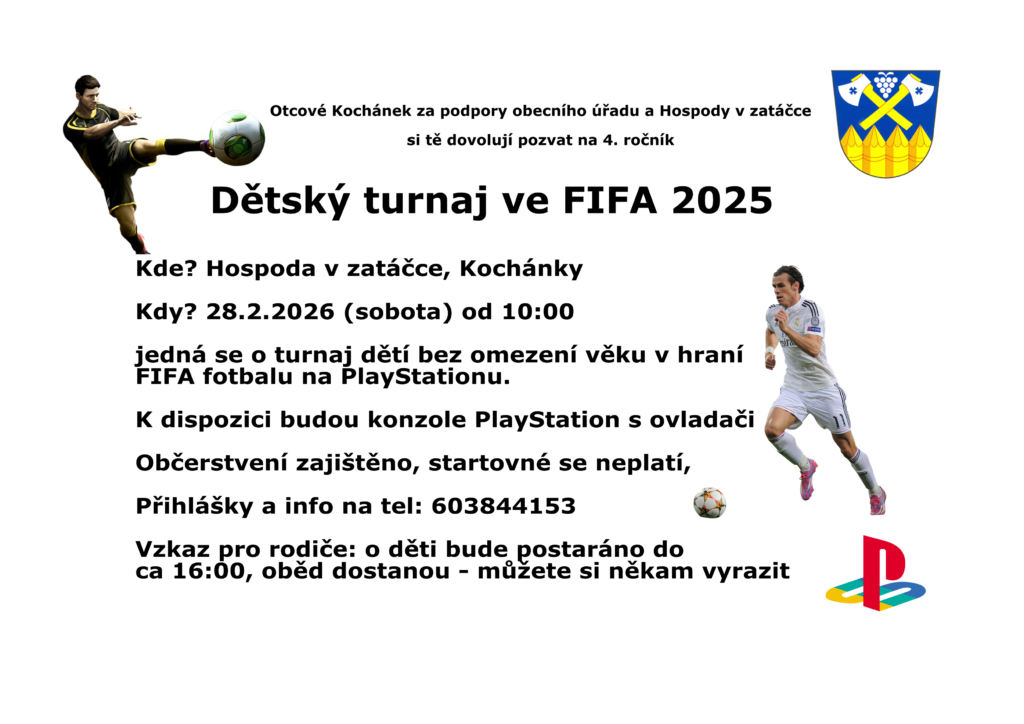 již počtvrté si dovolujeme pozvat děti na tradiční PlayStation FIFA turnaj. Dne 28.2.2026 se v 10:00 potkáme v hospodě v Kochánkách a rozdáme si to ve videohrách. K vyzkoušení bude PS virtuální reality, občerstvení a super nálada.
